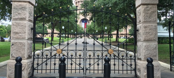 I’m outside the Texas State Capitol grounds at the standoff perimeter. There are beautiful flowers, a low wall and an ornate gate with bollards in front of it. Just to either side of me is a driveway with retractable bollards so cars can exit. The Capitol grounds also maximize the distance from the street to the building. There are paths and shade and statues and plaques. This is both successful site security design and a beautiful public space.