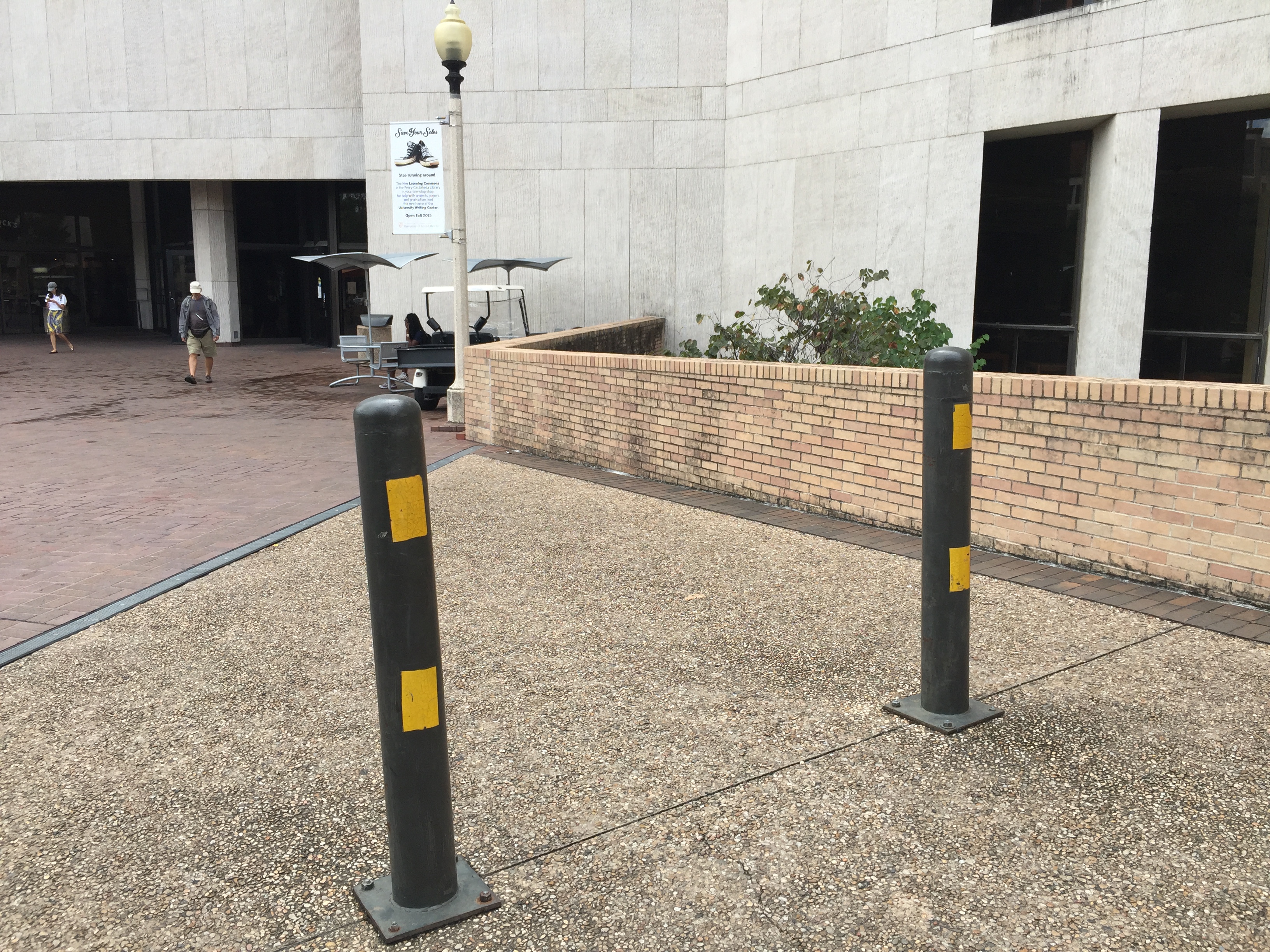 Bollards outside Perry-Castañeda Library Published on September 17, 2015 in Bollards of Austin, TexasFull resolution (3264 × 2448) ← Previous Next → These bolt-in bollards are mostly to keep cars from driving in pedestrian areas. W 21st St, Austin, TX.